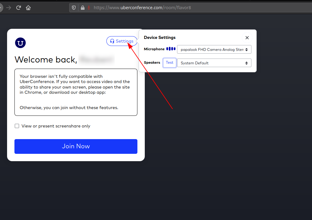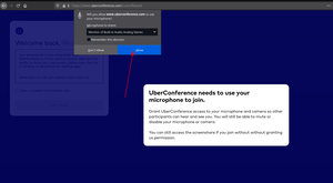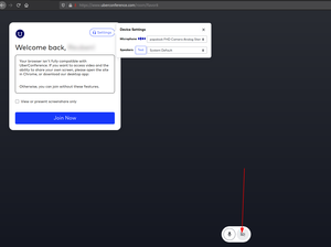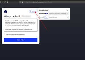 When joining with the browser link, you’ll be prompted to give uberconference access to your microphone. Once you have, you can click “settings”, and test whether the mic / speakers are working by talking. You can also turn off your video camera using the button at the bottom of the screen.